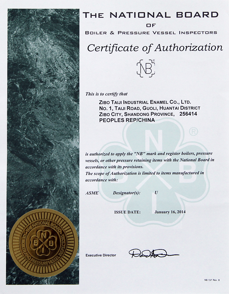 淄博太極在中國搪玻璃設備制造行業中首家通過ISO90001質量體系認證,并擁有美國ASME認證、歐洲PED認證以及國家部門頒發的搪玻璃制造許可證、進出口許可證和百余項榮譽證以及三十六項專利等。